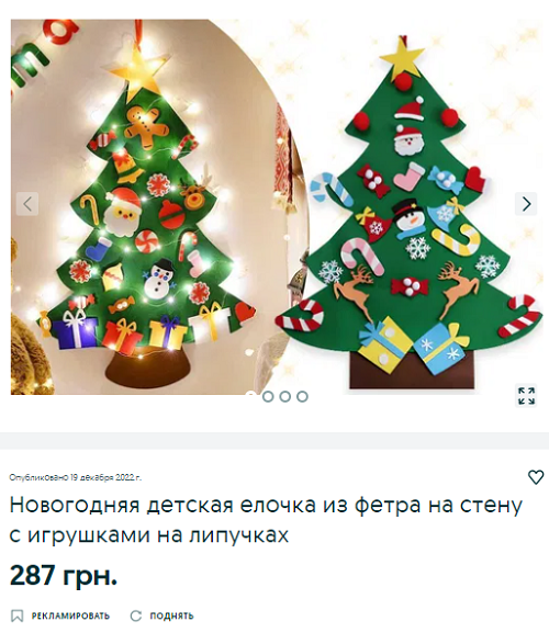 Ялинка із фетру та іграшками на липучках коштує 287 грн. Виробник позиціонує виріб як ялинку для дітей, яку можна прикріпити на стіну в кімнаті і прикрашати разом з дитиною. Висота «ялинки» 95 см. У комплекті йде 26 іграшок з того ж матеріалу, що і новорічне «дерево».