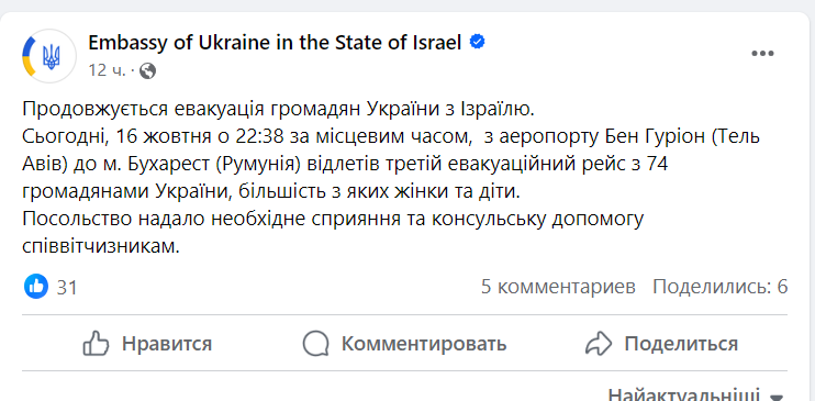 Продовжується евакуація громадян України з Ізраїлю. 16 жовтня о 22:38 за місцевим часом з аеропорту Бен Гуріон (Тель Авів) до м. Бухарест (Румунія) відлетів третій евакуаційний рейс з 74 громадянами України, більшість з яких жінки та діти. Посольство надало необхідне сприяння та консульську допомогу співвітчизникам, - йдеться у повідомленні.