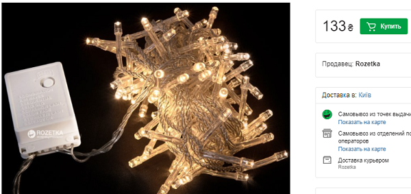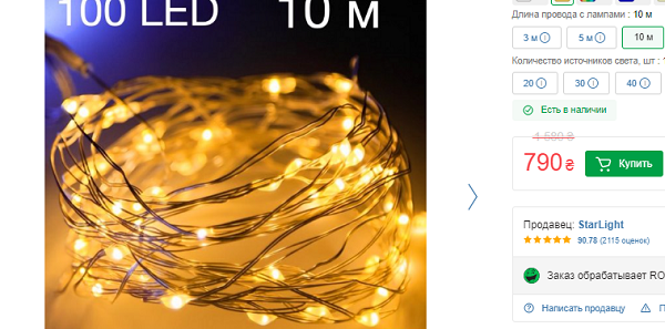 Гірлянда, що працює від батарей і має довжину 10 метрів, коштує 800 грн.