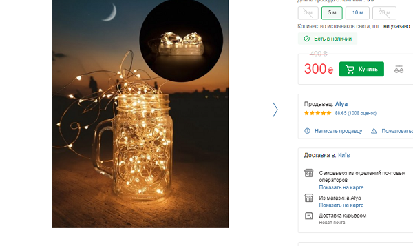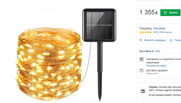 Гірлянда на світлодіодах з 300 лампочками та довжиною 30 метрів обійдеться у 1355 грн. Особливістю її є те, що гірлянда працює не лише від мережі, а й має сонячну батарею.