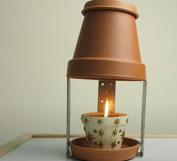 Також можна зробити обігрівач зі свічки та квіткового горщика. Вазон при цьому має бути з глини чи іншої кераміки, а не пластику. Знадобиться три горщики різного діаметру, великий металевий болт із шайбами та гайками.