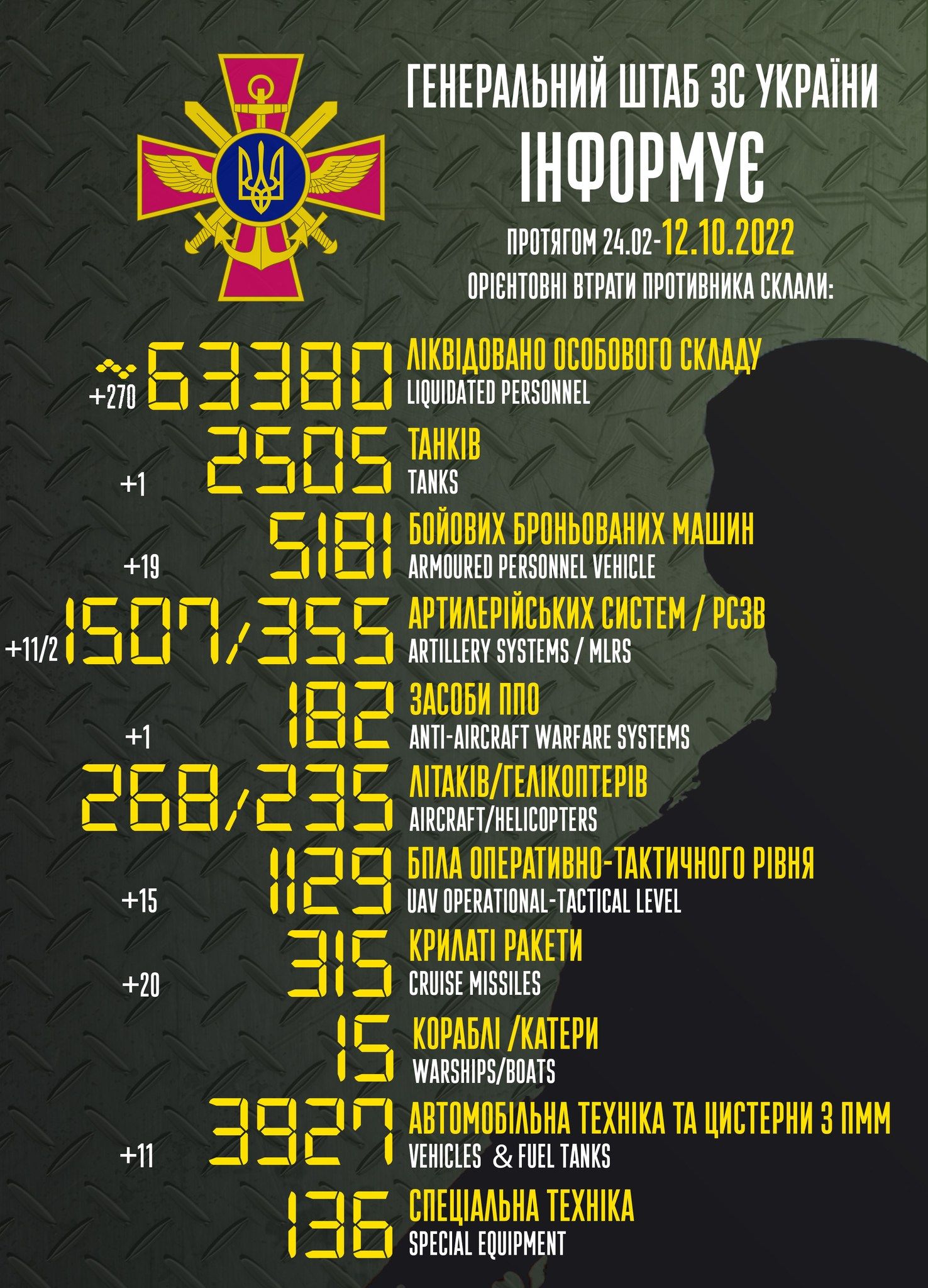 За добу мінус 15 БПЛА, 20 крилатих ракет, 270 росіян та 11 артсистем: втрати ворога на 12 жовтня