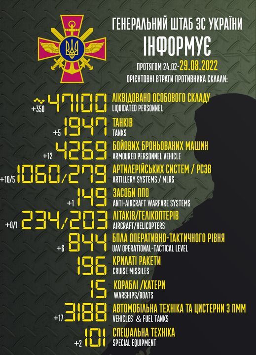 Загальні бойові втрати противника з 24.02 по 29.08 орієнтовно склали: