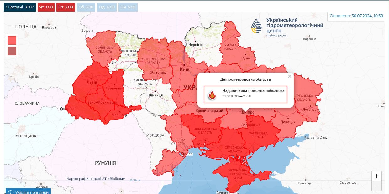 За даними Українського гідрометеорологічного центру на Дніпропетровщині з 31 липня по 2 серпня збережеться надзвичайний (V) рівень пожежної небезпеки.