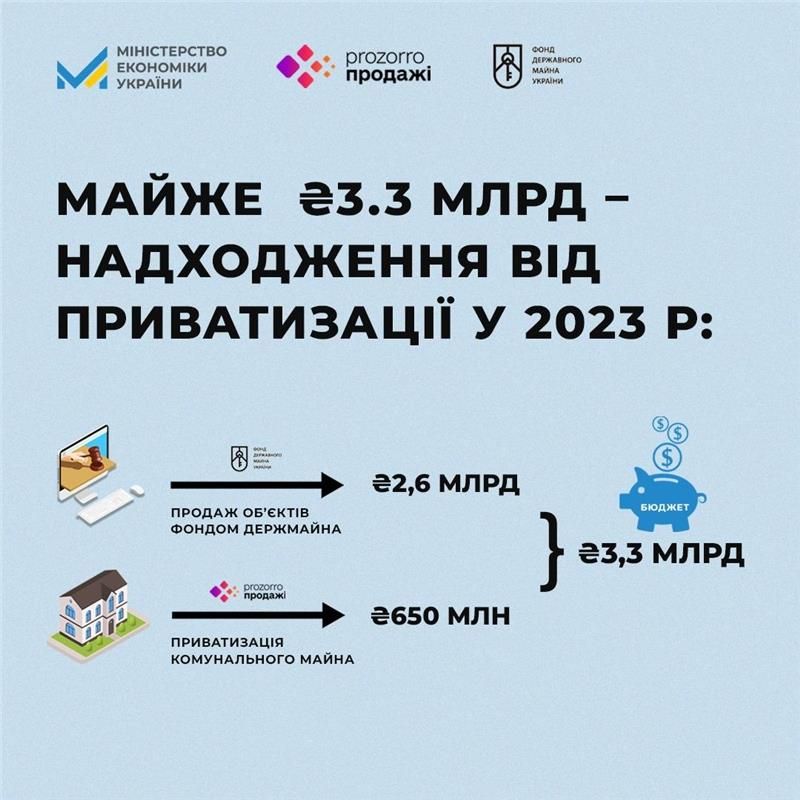 Як повідомили у Мінекономіки, тільки за 2023 році продаж об'єктів Фонду держмайна збагатив бюджети різних рівнів на понад 2,3 млрд гривень. Ще 650 млн заробили на приватизації громади. За підсумками електронних аукціонів ціна об’єктів зросла майже втричі.
