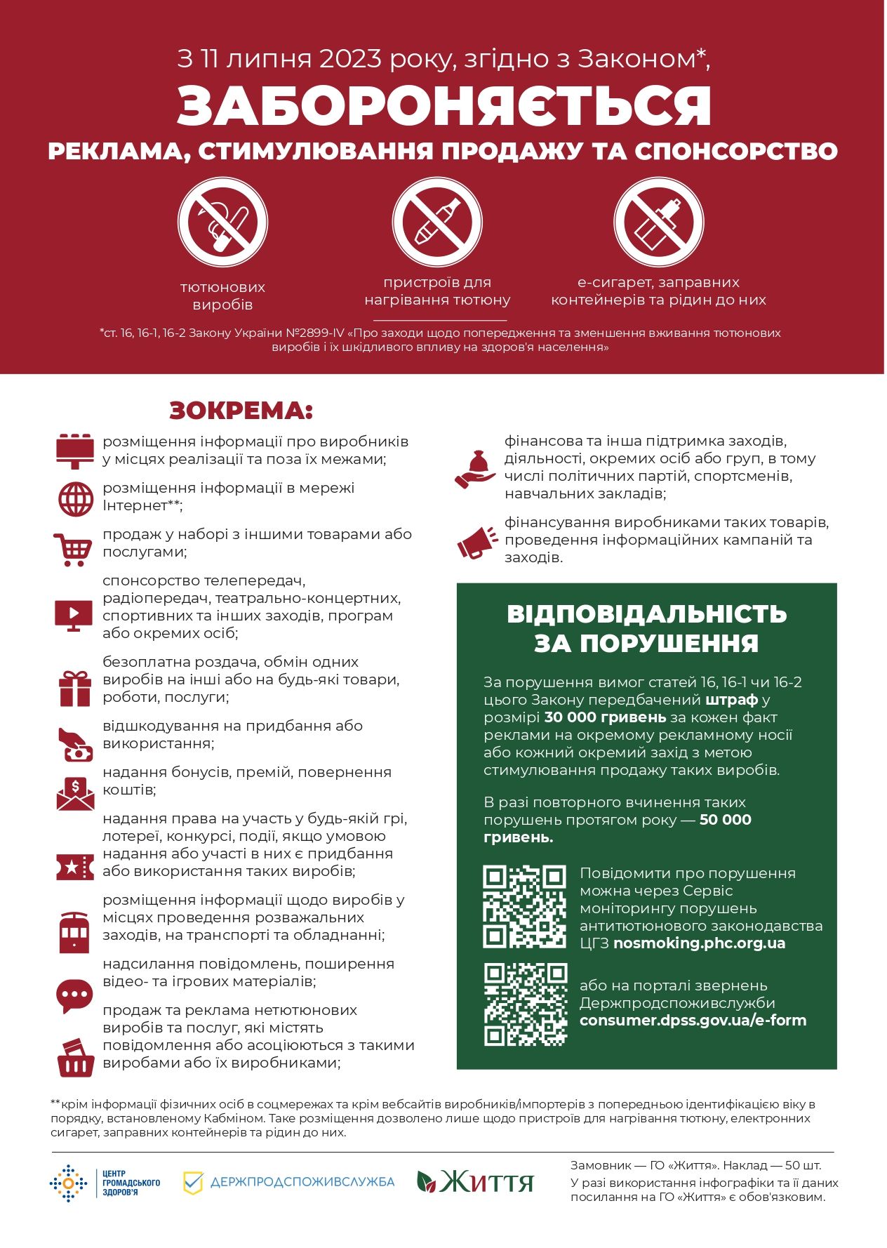 Повністю заборонена будь-яка реклама та спонсорство електронних девайсів для куріння та ароматизованого тютюну. Про це повідомляє Держпродспоживслужба.