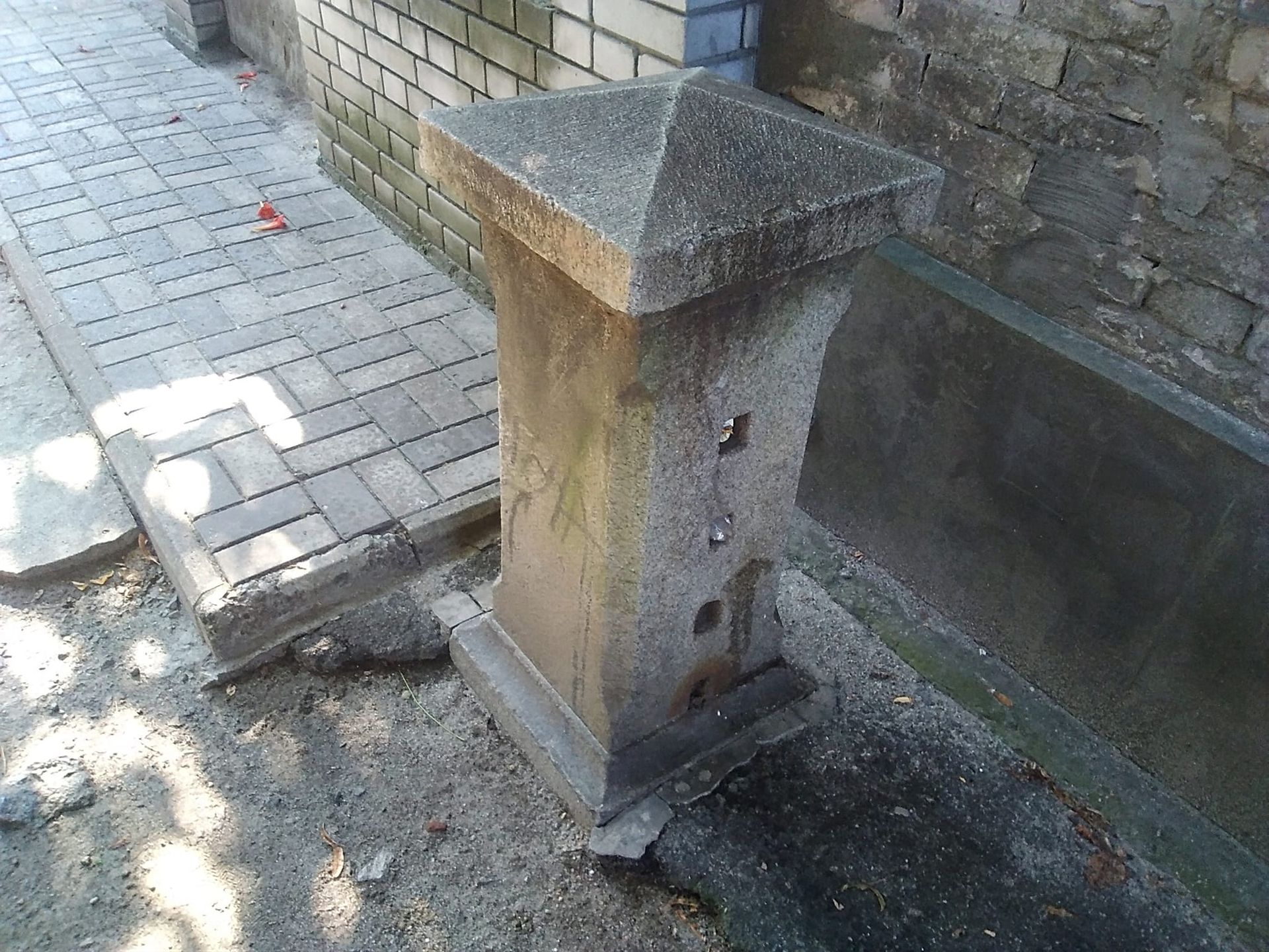 На розі стоїть така ось гранітна тумба. Хто знає чи здогадається, що це? Залишки огорожі? Але в щільну стіну будинку? Загадка, - написав Павло.