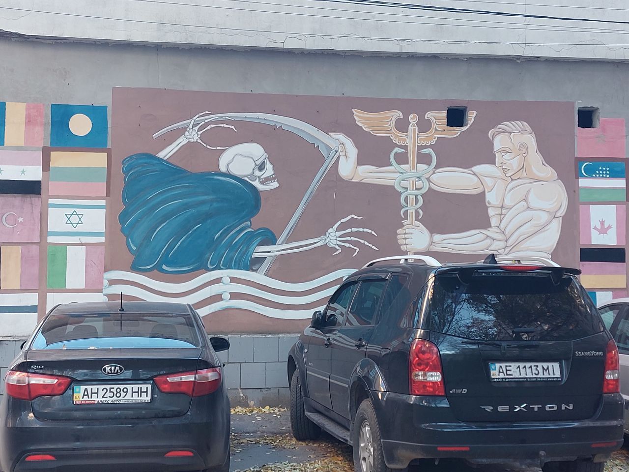 Нещодавно на стіні "Кінгстона" з'явився малюнок. Незвичайне графіті створили студенти-медики, які мешкають по сусідству. На малюнку смерть з косою зупиняє сильний юнак, який тримає в руках «знак» медиків.