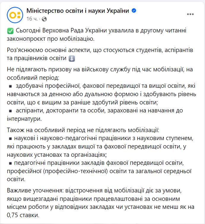 Важливе уточнення: відстрочення від мобілізації діє за умови, якщо вищезгадані працівники працевлаштовані за основним місцем роботи у відповідних закладах чи установах не менш як на 0,75 ставки, - зазначили у МОН.