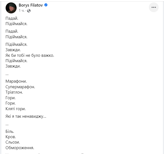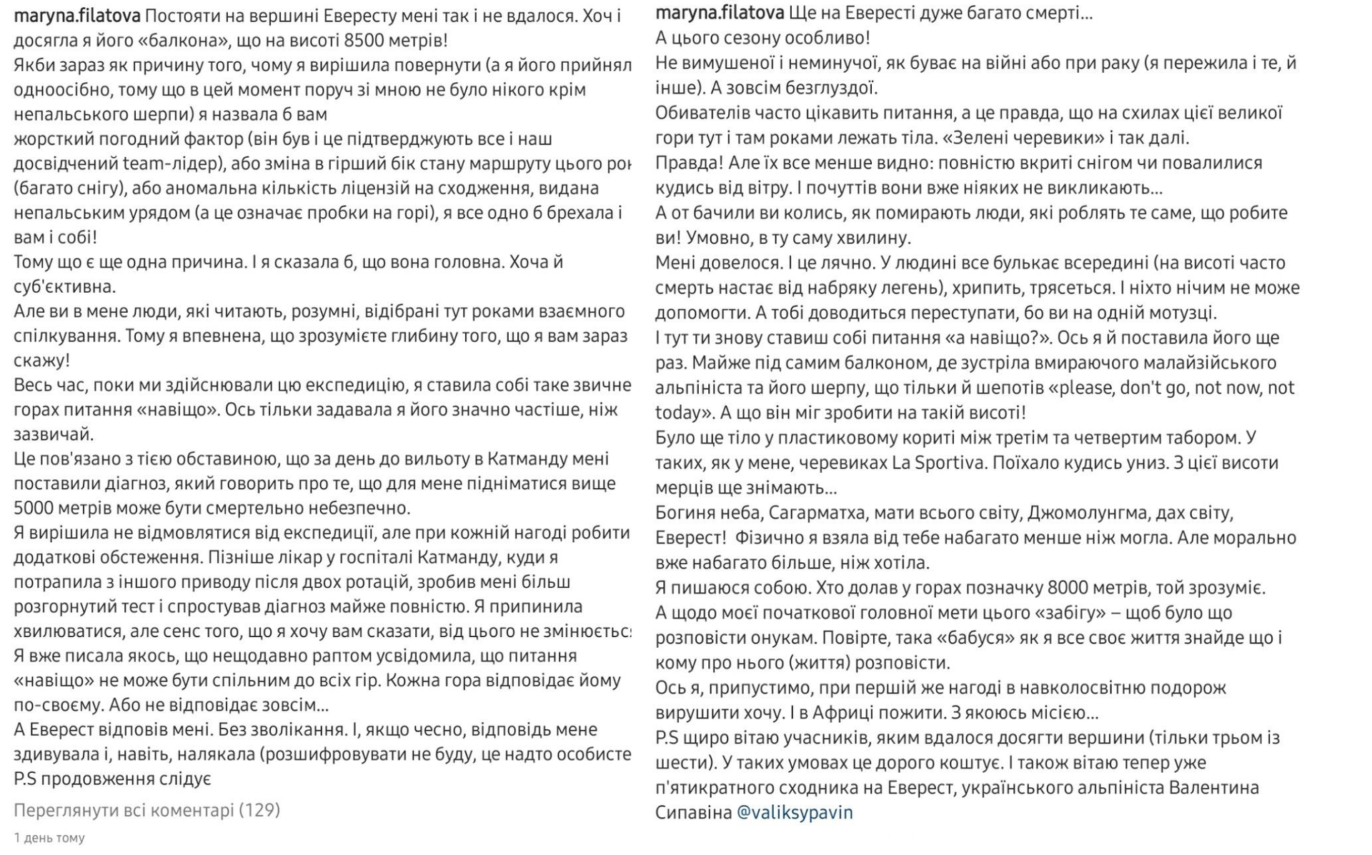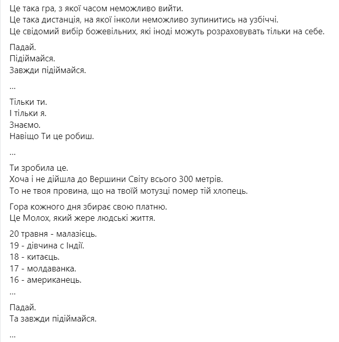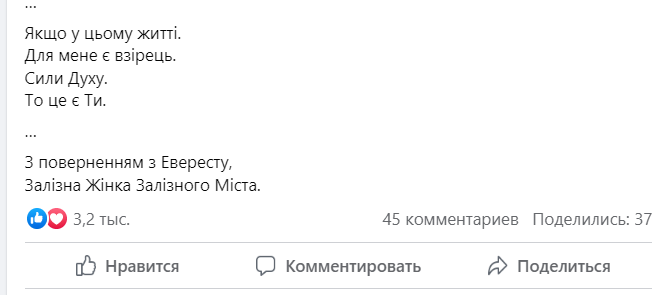 Ти зробила це. Хоча і не дійшла до Вершини Світу всього 300 метрів. То не твоя провина, що на твоїй мотузці помер той хлопець... Якщо у цьому житті. Для мене є взірець. Сили Духу. То це є Ти. З поверненням з Евересту, Залізна Жінка Залізного Міста, - написав він.