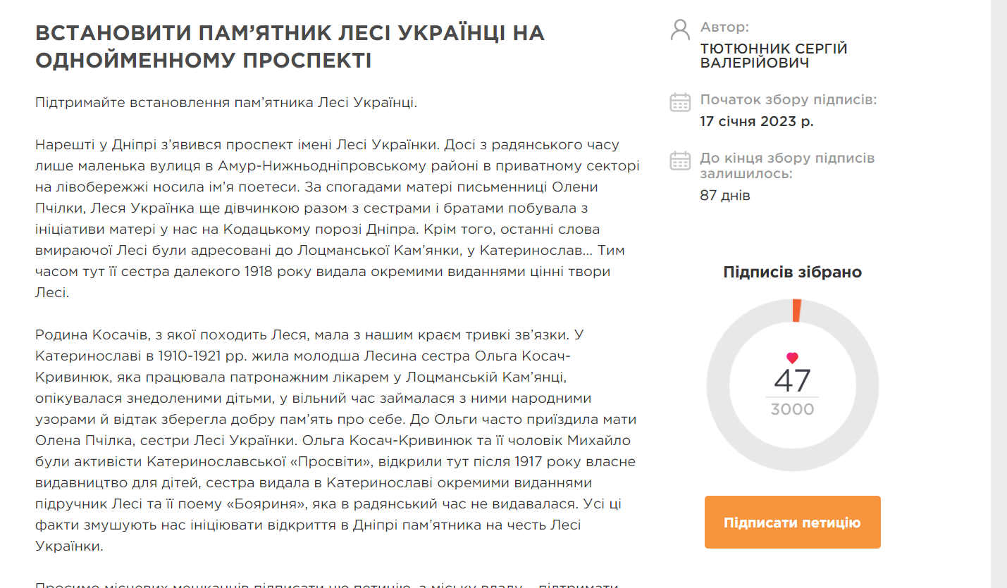У містян ще є 87 днів, аби підтримати цю ініціативу. Наразі петицію підписали 47 чоловік із 3000 необхідних.
