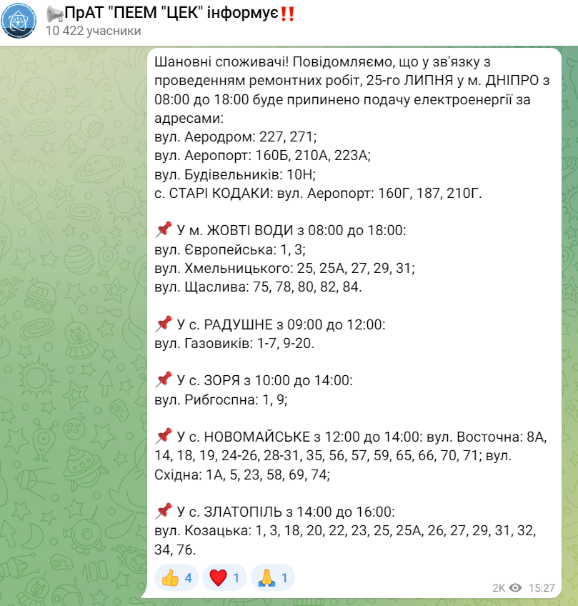 У вівторок, 25 липня, у Дніпрі відключать світло на 10 годин - з 08:00 до 18:00.