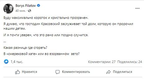 Буду максимально короток и кристально прозрачен. Я думаю, что господин Красовский заслуживает той доли, которую он пророчил нашим детям. И я почти уверен, что это рано или поздно случится. … Какая разница где сгореть? В «смерековой хате» или во взорванном авто, - зазначив Філатов.