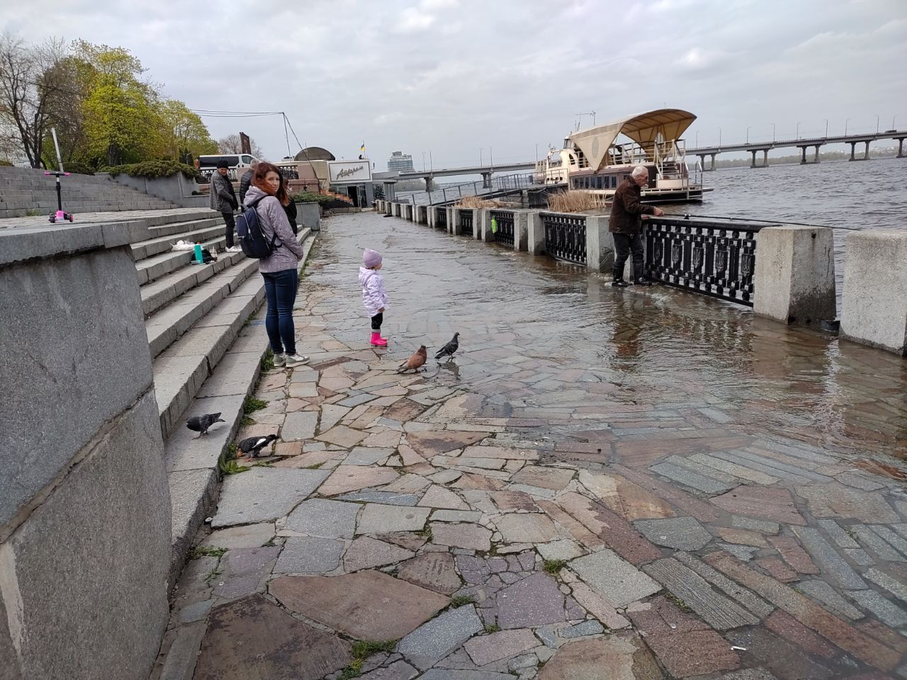 Гуляючи по набережній Дніпра можна побачити, наскільки сильно піднявся рівень води в річці. Відстань між водою та пішохідною зоною на причалах становить близько 15 см, але в центрі міста вода давно вже вийшла «з берегів» і щосили хлюпається на гранітних доріжках.
