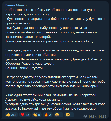 Заступниця міністра оборони України Ганна Маляр закликала українців не обговорювати контрнаступ ЗСУ, аби не заважати військовим. Вона зазначила, що саме інформаційна тиша дала змогу бійцям виграти час і зробити свою роботу під час визволення Харківщини.