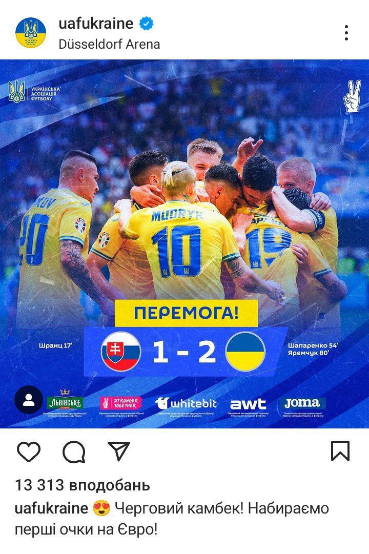 Збірна України перемогла Словаччину у матчі Євро-2024 з рахунком 2:1.