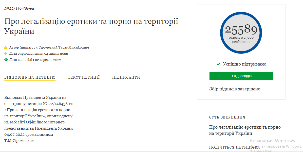Глава держави заявив, що реалізацію державної політики у сфері захисту суспільної моралі й обігу продукції і видовищних заходів сексуального характеру забезпечує Кабінет міністрів, тому передав петицію на розгляд уряду.