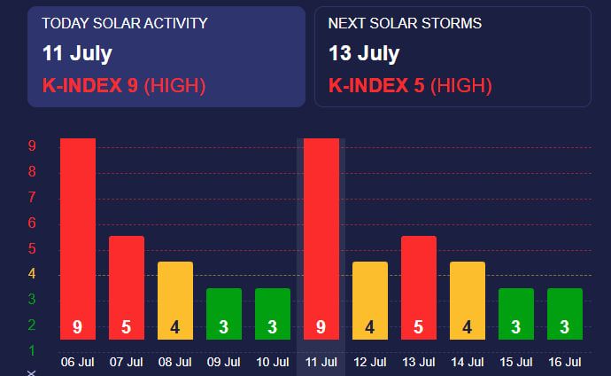 Зокрема, на порталі MeteoAgent, який вираховує магнітну активність, загальні показники для Землі становили 9 балів для 6 липня, а також на сьогодні, 11 липня, по К-індекс дійшов позначки "5" 7 липня, а також очікується 13 липня. Показники 4 можна було побачити 8 липня.