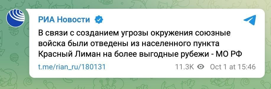 У свою чергу, міноборони росії (читай - вбивства) заявило про відведення своїх військ із Лимана.