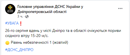 Сьогодні, 26 серпня, у Дніпрі та області очікуються пориви східного вітру 15-20 м/с.
