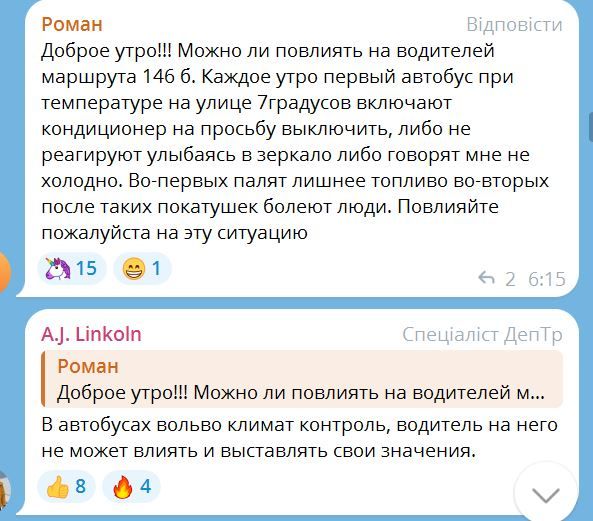 Чи можна вплинути на водіїв маршруту 146Б? Кожен ранок при температурі на вулиці 7 градусів вмикають кондиціонер, а на прохання вимкнути або не реагують, або посміхаються в дзеркало і кажуть, що їм не холодно. По перше, вони витрачають непотрібне паливо, а по друге - після такої поїздки хворіють люди, -https://t.me/DeptransDmr/201961 написав незадоволений сервісом пасажир.