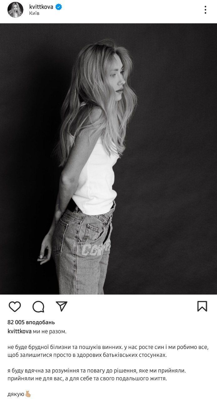 Не буде брудної білизни і пошуку винних. У нас росте син, і ми робимо все для того, щоб залишитися в хороших батьківських відносинах. Я буду вдячна за розуміння і повагу до рішення, яке ми ухвалили. Ухвалили не для вас, а для себе і подальшого життя, - написала Квіткова.
