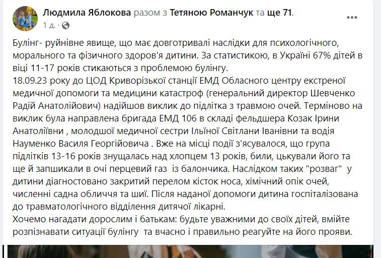 Як повідомила співробітниця Криворізької станції ЕМД Людмила, 18 вересня бригада швидкої виїжджала до 13-річного хлопчика, якого побили хулігани. На місці медики з'ясували, що група підлітків 13-16 років знущалась зі школяра. Вони били, цькували його, а потім забризкали в очі перцевий газ із балончика.