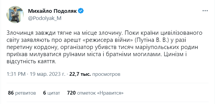 Поки країни цивілізованого світу заявляють про арешт "режисера війни" (путіна в. в.) у разі перетину кордону, організатор убивств тисяч маріупольських родин приїхав милуватися руїнами міста і братніми могилами. Цинізм і відсутність каяття, - написав Подоляк.