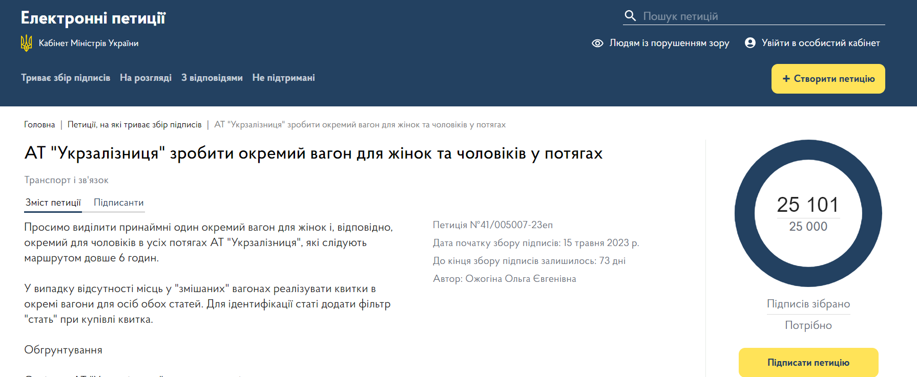 Також на сайті Кабінету міністрів була створена петиція із закликом зробити окремий вагон для жінок і чоловіків у поїздах "Укрзалізниці".