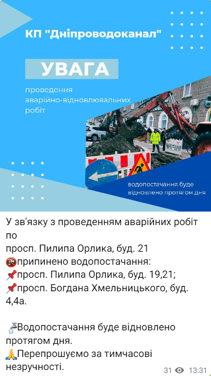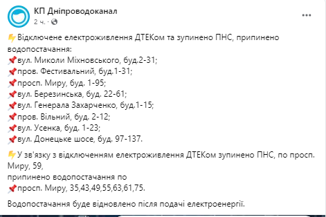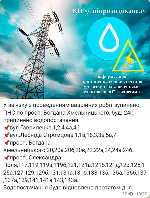 Знеструмлення та аварійні роботи: де сьогодні у Дніпрі немає води