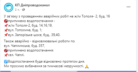 Крім того, тривають аварійно-відновлювальні роботи на вул. Чаплинській, 357. Тому без води сел. Чаплі.