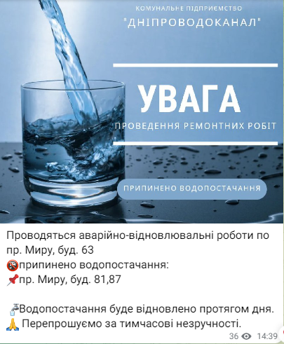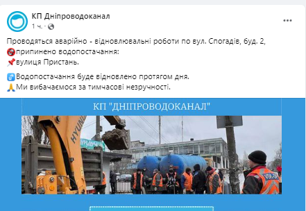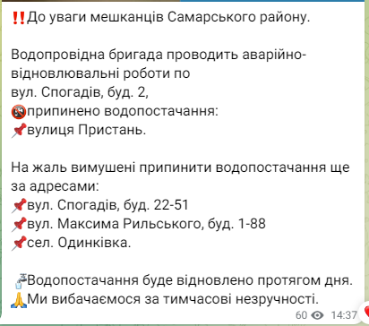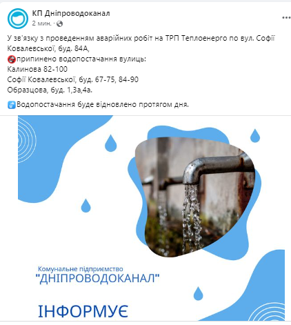 Крім того, через проведення аварійно-відновлювальних робіт на вул. Спогадів, 2 припинено водопостачання: