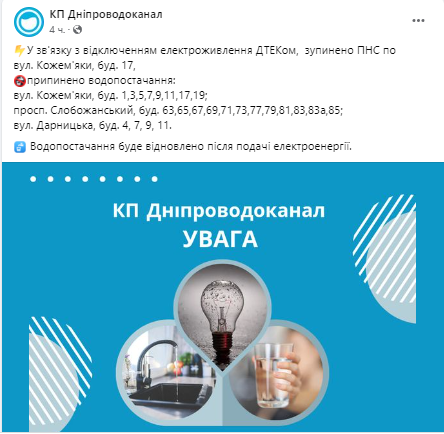 Так, у зв'язку з відключенням електроживлення зупинено ПНС на вул. Кожем'яки, 17. Тому припинено водопостачання: