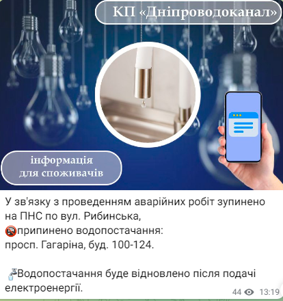 Знеструмлення та аварійні роботи: десятки будинків у Дніпрі сьогодні залишилися без води