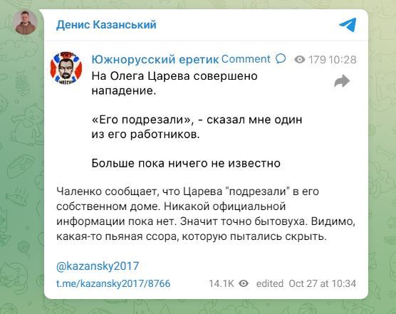 Чаленко повідомляє, що Царьова "підрізали" у його власному будинку. Жодної офіційної інформації поки що немає. Значить точно побутовий злочин. Мабуть, якась п'яна сварка, яку намагалися приховати, – прокоментував повідомлення Чаленка Казанський.