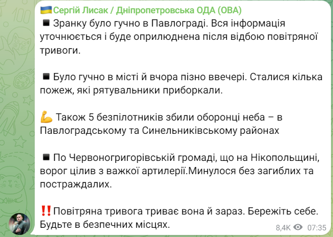 Повітряна тривога триває. Бережіть себе. Будьте в безпечних місцях, - закликав Лисак.