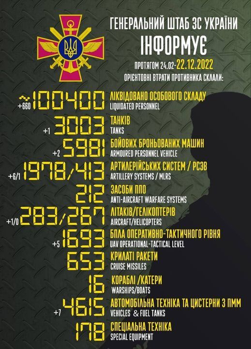 Загальні бойові втрати противника з 24.02 до 22.12 орієнтовно склали: