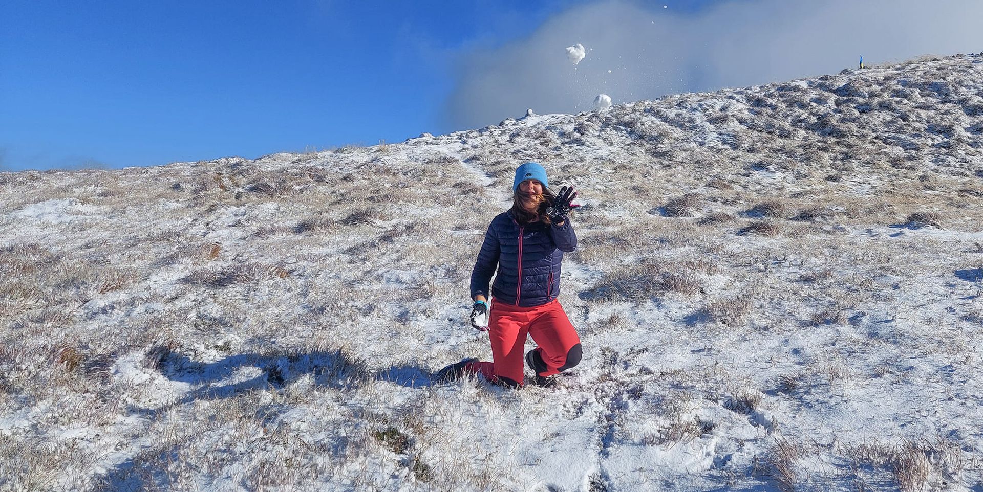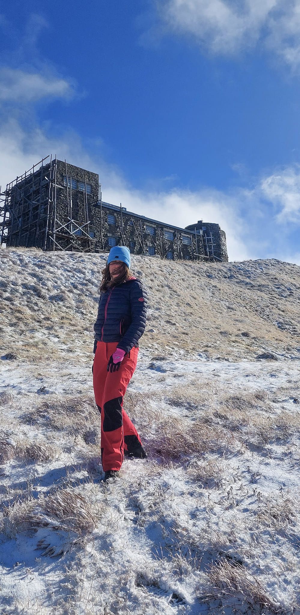 На кадрах видно, що сніг покрив землю тонким шаром. При цьому на вершині дуже сильний вітер.