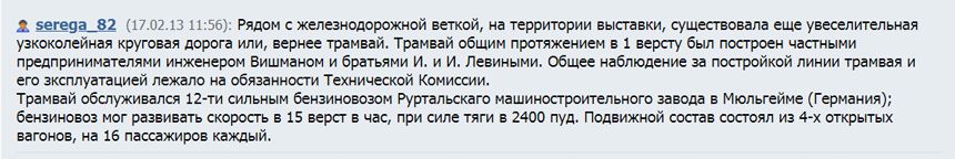На городском сайте удалось найти комментарий*** пользователя, который более детально описывает устройство дороги и самого состава, предположительно цитата из Альбома выставки: