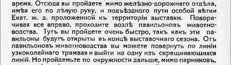 …Отсюда вы пройдете мимо железно-дорожного отдела, имея его по левую руку, и подъездного пути особой ветки Екатерининской железной дороги. проложенной к территории выставки…. От павильонов животноводства вы можете повернуть по линии узкоколейного трамвая и выйти на одну из скрещивающихся линий».