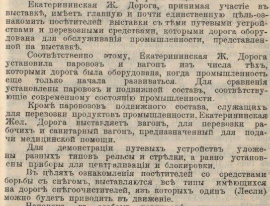 «Екатерининская железная дорога, принимая участие в выставке, имеет главную и почти единственную цель – ознакомить посетителей выставки с теми путевыми устройствами и перевозными средствами, которыми дорога оборудована для обслуживания промышленности, представленной на выставке.
